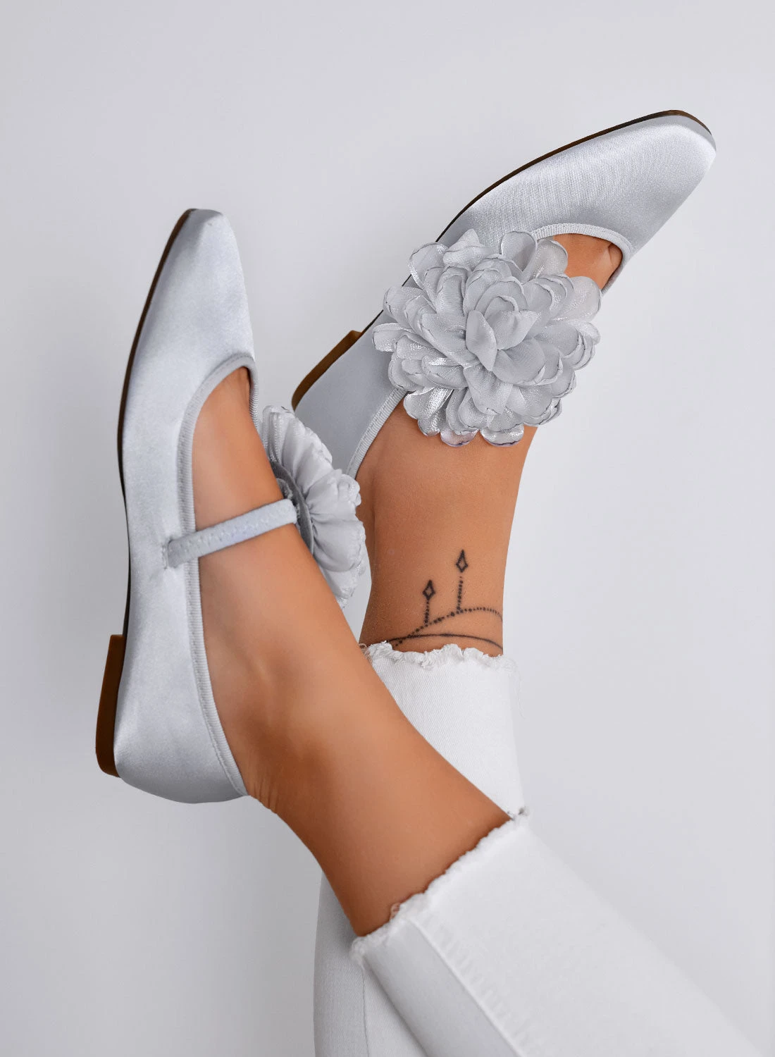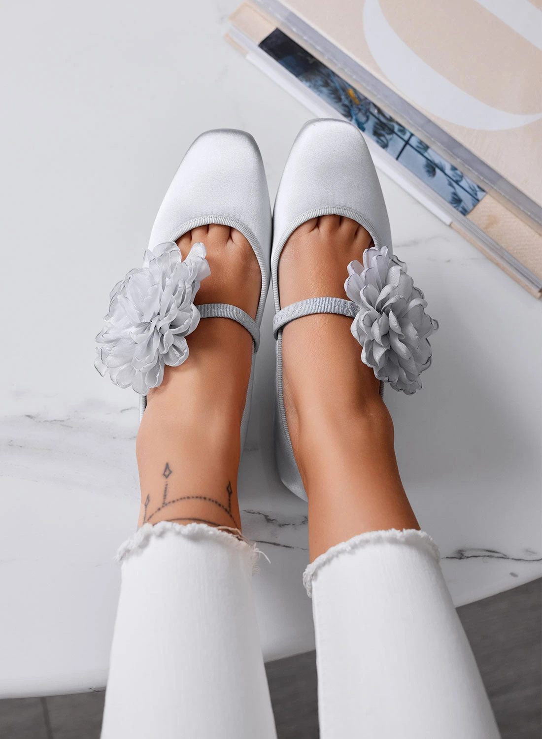 🌹 Raffinatezza assoluta: queste ballerine argento in tessuto effetto raso con elegante applicazione floreale laterale aggiungono classe e femminilità ai tuoi look. Perfette per eventi speciali o per un outfit quotidiano elegante, garantiscono comfort e stile con un tocco di romanticismo. 🌸✨