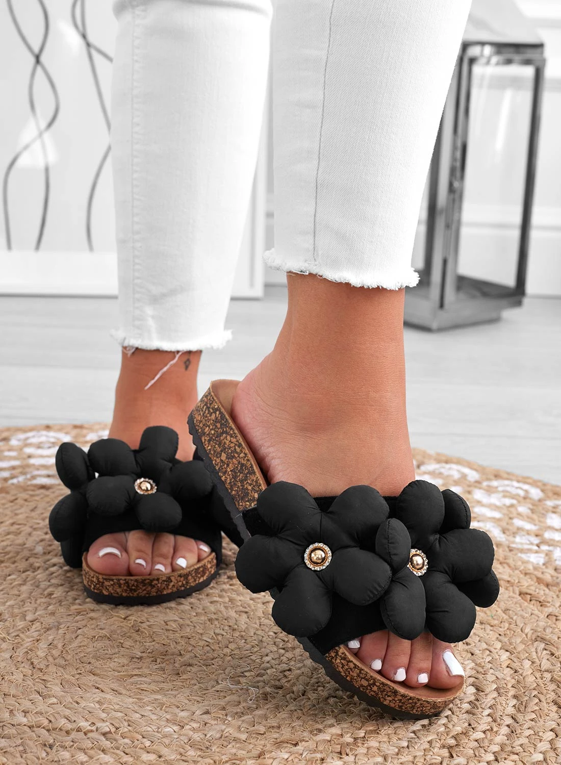 BARBARA – Sandali A Ciabatta Neri Con Fiori Morbidi
