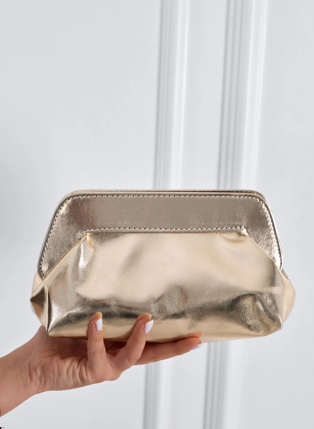 Aggiungi un tocco di eleganza al tuo look con questa clutch bag oro in ecopelle 🖤. Perfetta per occasioni speciali o serate glamour, questa borsa compatta presenta una silhouette morbida e arricciata. Il design minimal e sofisticato la rende versatile e facile da abbinare con qualsiasi outfit. ✨