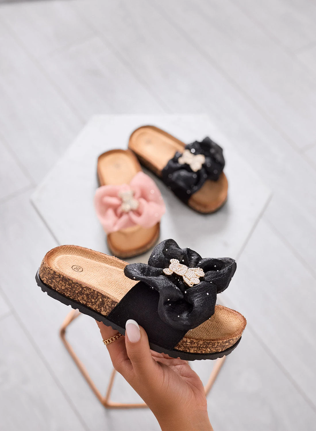 🐻 Super dolci e brillanti! Queste ciabatte da bambina sono decorate con un maxi fiocco in organza e un orsetto gioiello al centro.