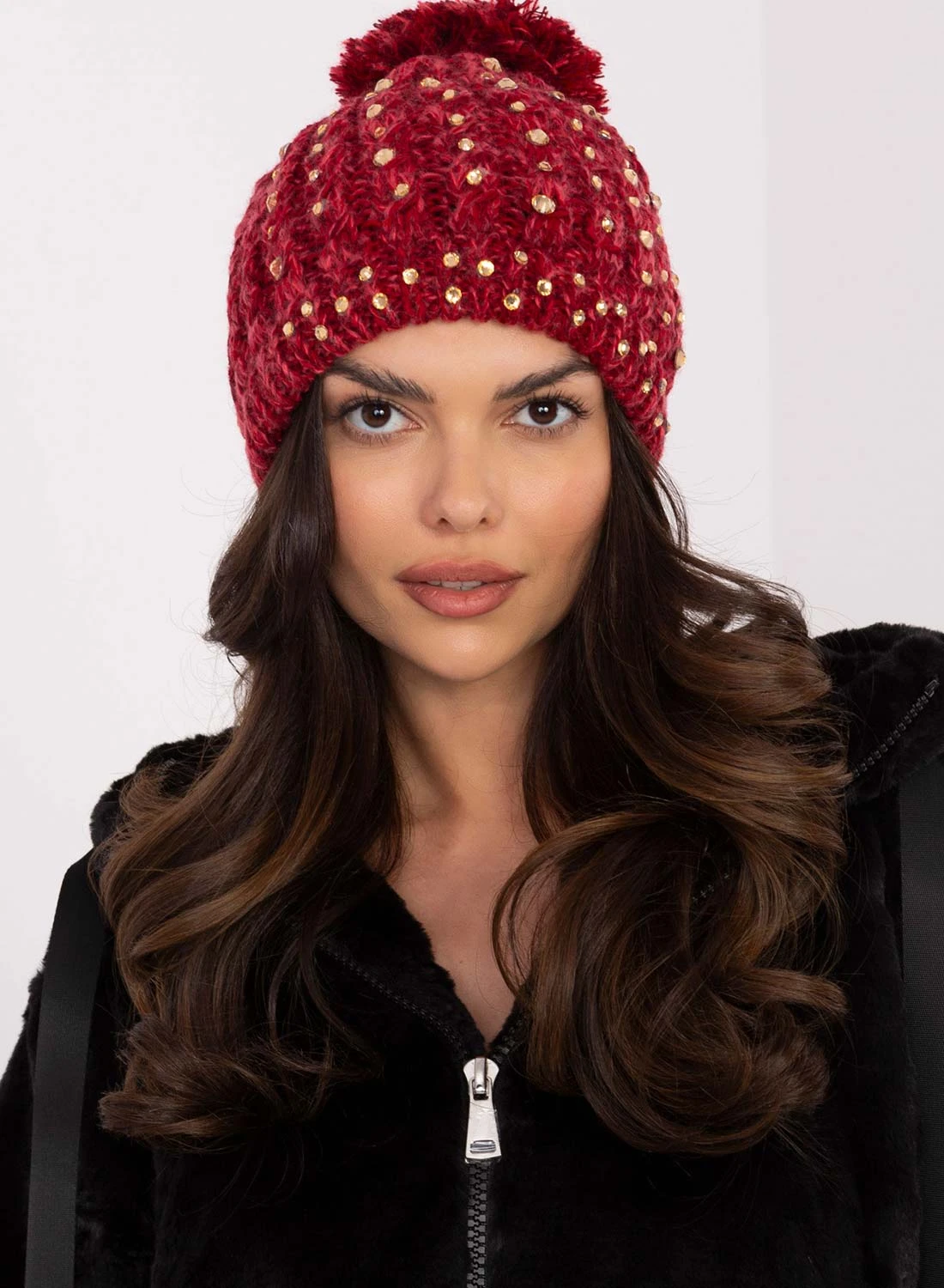 Cappello Rosso Imbottito Con Strass E Pompon
