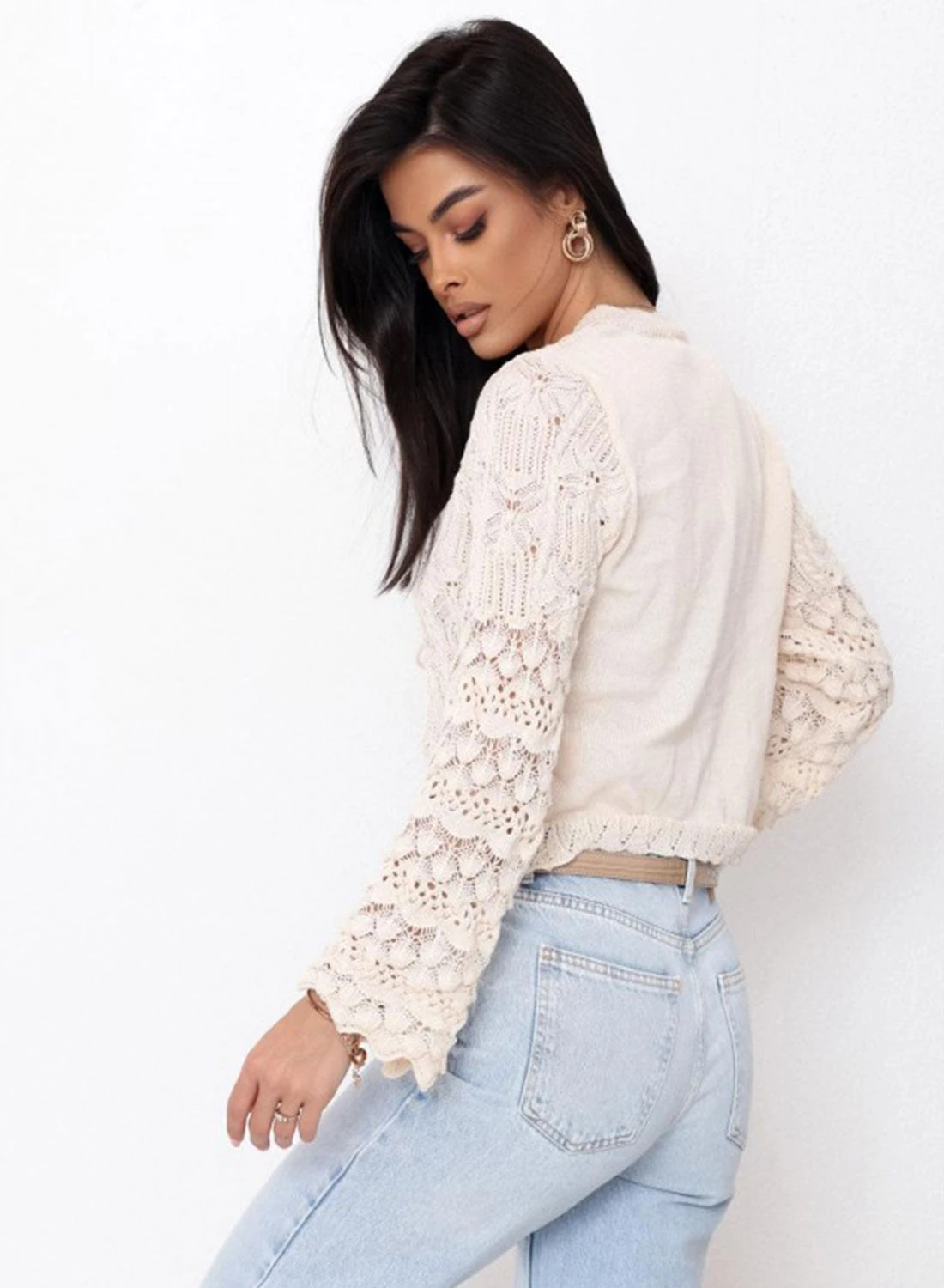 Aggiungi un tocco romantico al tuo look con questo cardigan corto in maglia traforata con maniche lunghe e laccetti. Realizzato in lavorazione a maglia traforata, è perfetto per creare outfit femminili e raffinati. Il design corto con scollo a V valorizza la silhouette, mentre i laccetti frontali permettono di regolare la chiusura per un tocco di originalità.