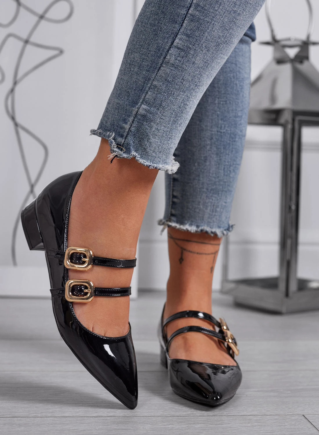 Scopri le Mary Jane a punta in vernice nera, perfette per un look elegante e sofisticato. Il design affusolato e il finish lucido esaltano lo stile, mentre la doppia fibbia dorata aggiunge un tocco raffinato e garantisce una calzata comoda. Il tacco basso e largo assicura comfort per tutto il giorno, rendendole ideali per abbinamenti con jeans, gonne o pantaloni eleganti. Perfette per ogni occasione, dal lavoro agli eventi serali, queste scarpe donano un’eleganza senza tempo. Acquista ora e aggiungi un tocco di classe al tuo outfit!