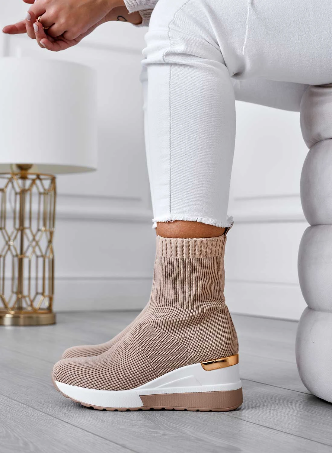 JUNA – Stivaletti Beige In Tessuto Elastico Con Zeppa