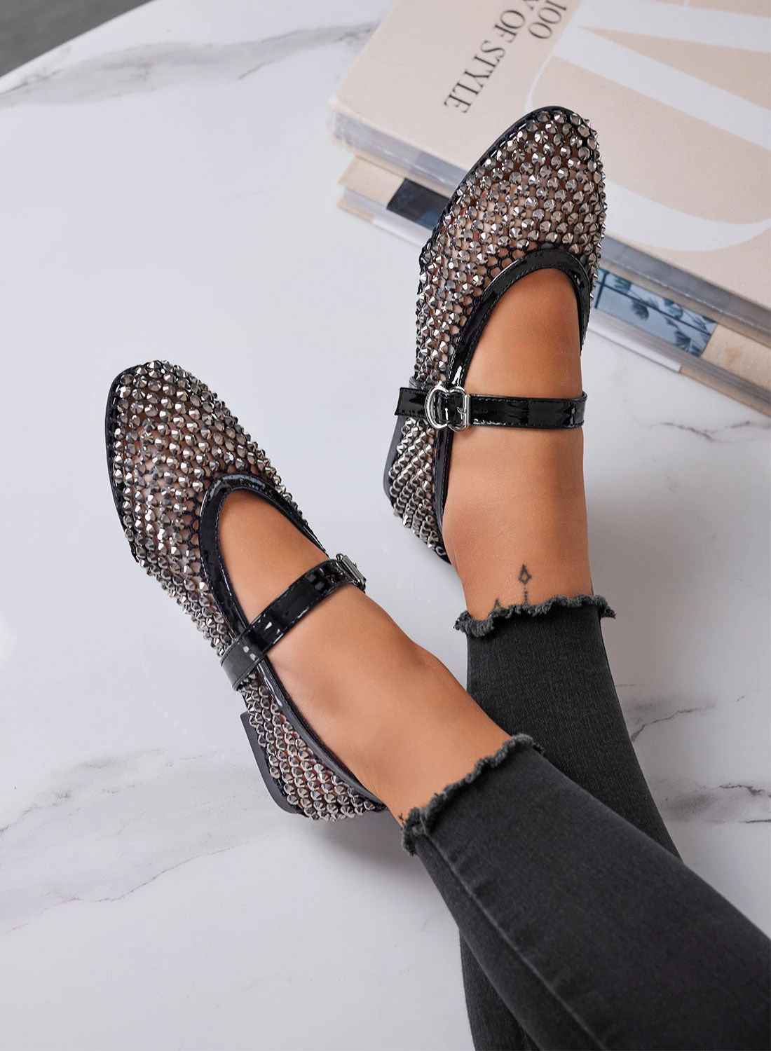 Aggiungi un tocco di brillantezza al tuo look con queste ballerine nere con strass e cinturino regolabile. Il design glamour, impreziosito da una cascata di strass scintillanti, le rende perfette per un look sofisticato e di tendenza. Il cinturino regolabile con fibbia dorata assicura una calzata confortevole e stabile, mentre la suola flat le rende ideali per un utilizzo quotidiano o per occasioni speciali.