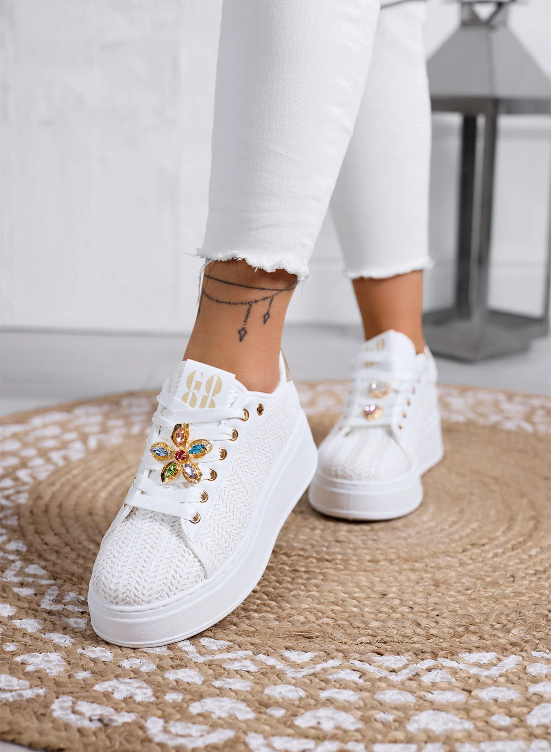 Queste sneakers in tessuto intrecciato uniscono lo stile sporty alla raffinatezza dei charms gioiello applicati sui lacci. Il platform slancia la figura, mentre il colore delicato le rende perfette per i tuoi look più primaverili.