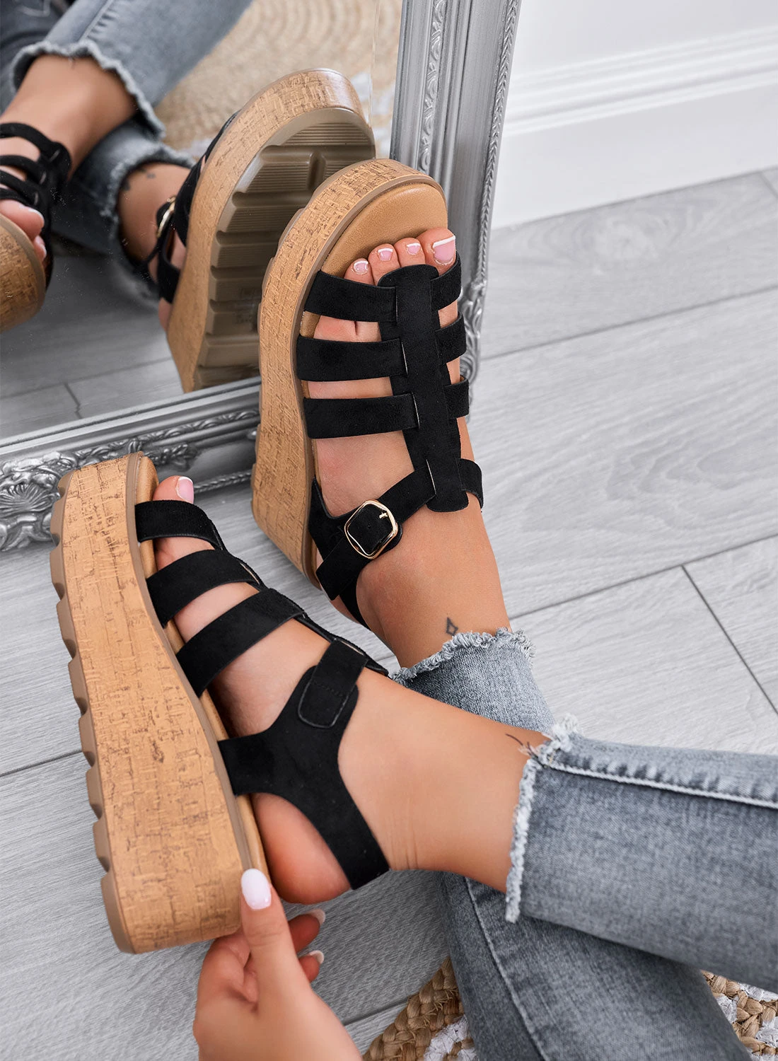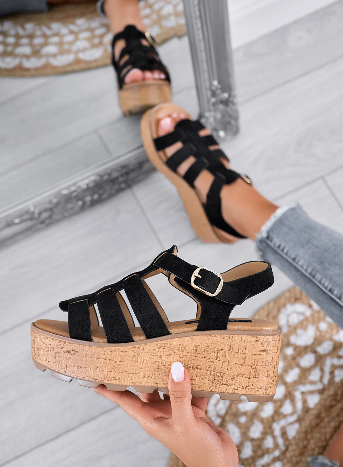 🪵 La suola alta effetto sughero dona un tocco naturale, mentre la fibbia dorata regala un dettaglio elegante e regolabile.