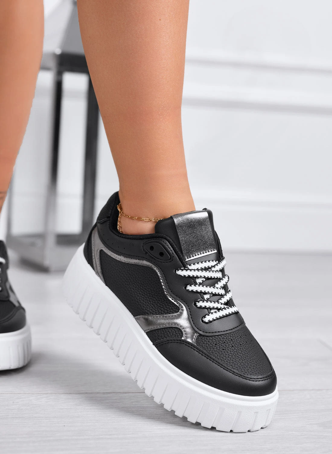 Distinguiti con stile grazie a queste sneakers bianche platform, impreziosite da eleganti dettagli dorati ✨. Perfette per chi ama un look sportivo ma ricercato, queste scarpe combinano comfort e altezza extra con una suola alta e dentellata che assicura stabilità e un tocco trendy.