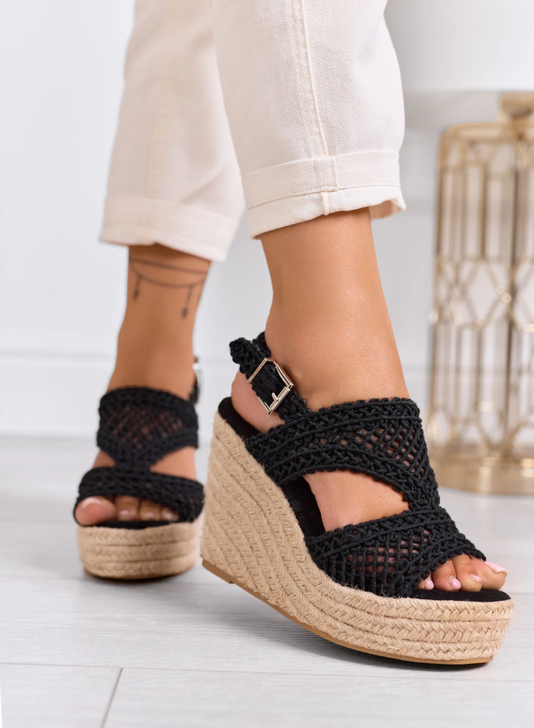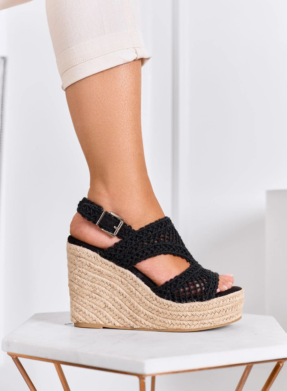 🌞 Perfette per esaltare i tuoi look estivi! Queste zeppe nere con lavorazione crochet e maxi suola in corda uniscono stile boho e comfort.