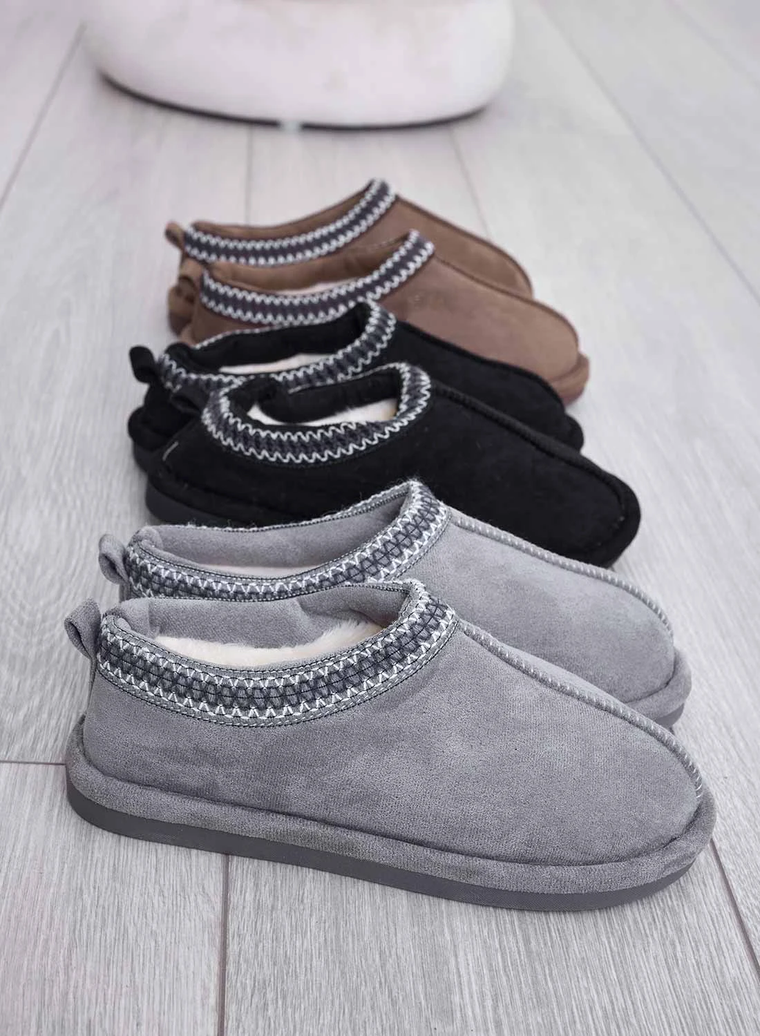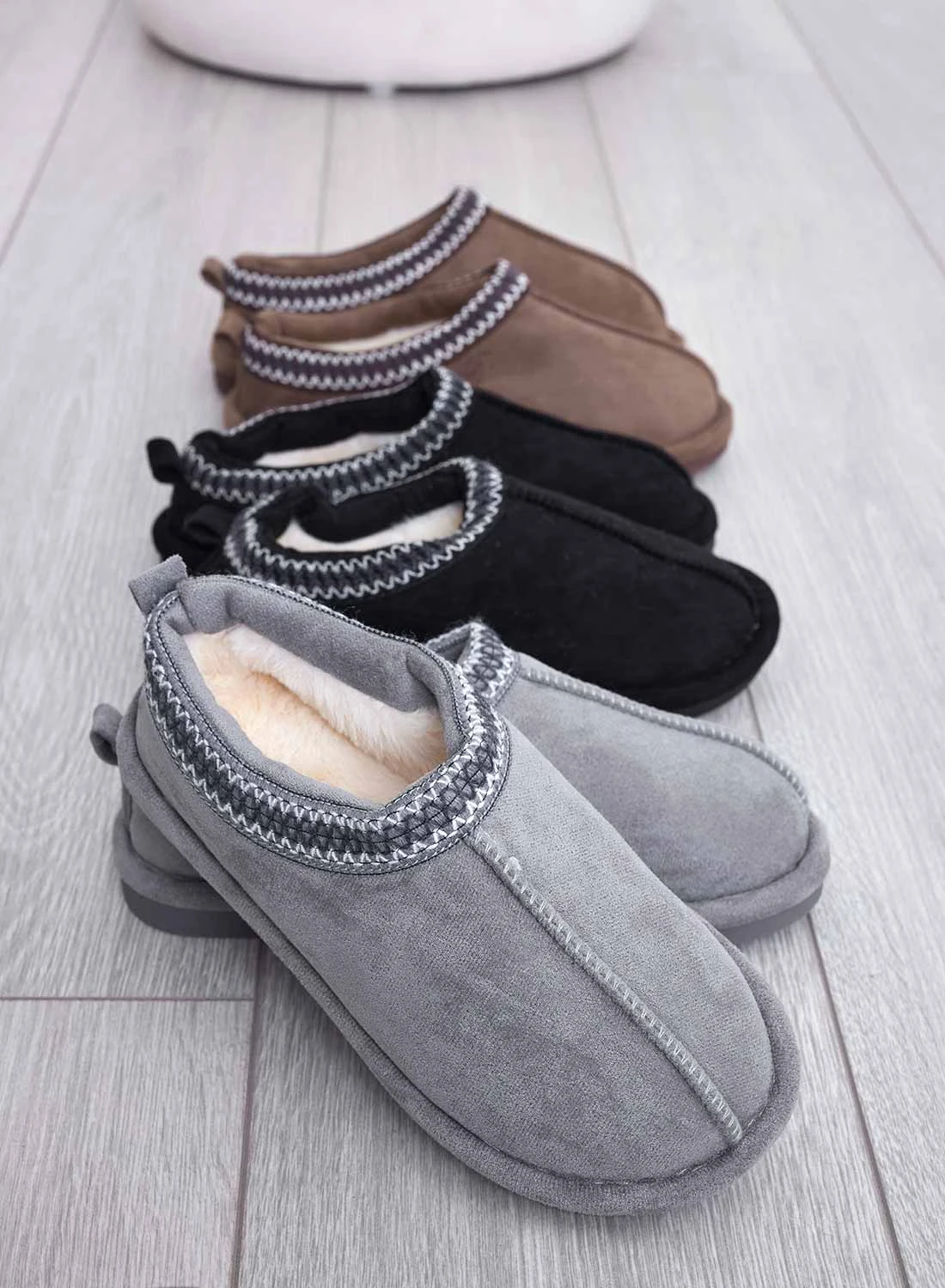 - Materiale: Tomaia in tessuto scamosciato Plantare e Fodera in ecopelliccia Suola gomma