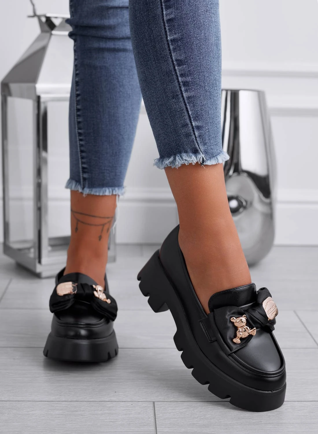SERENA – Mocassini Neri Con Fiocco E Spilla Teddy Oro