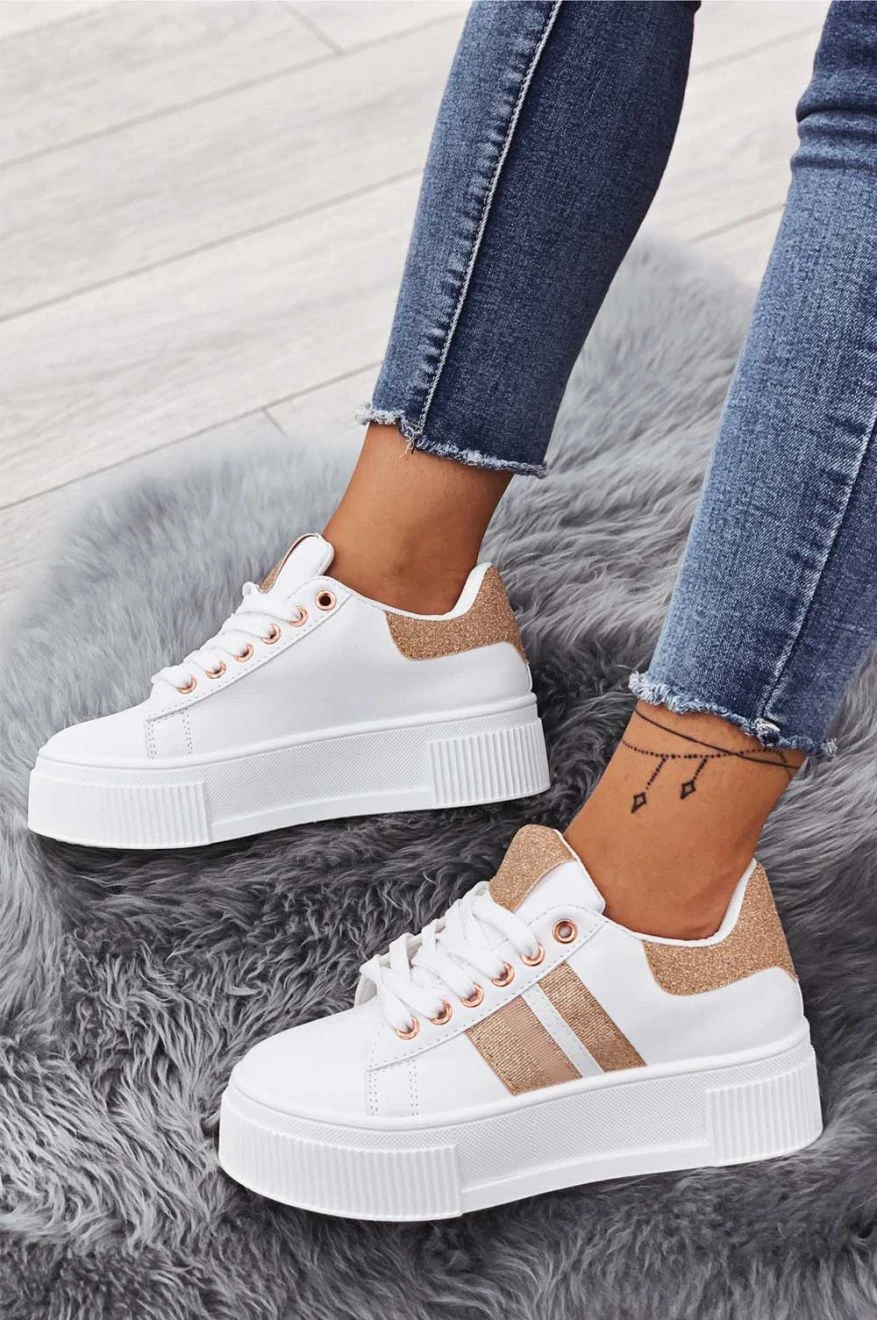 Sneakers Bianche Con Lacci E Inserti Glitter Oro Rosa