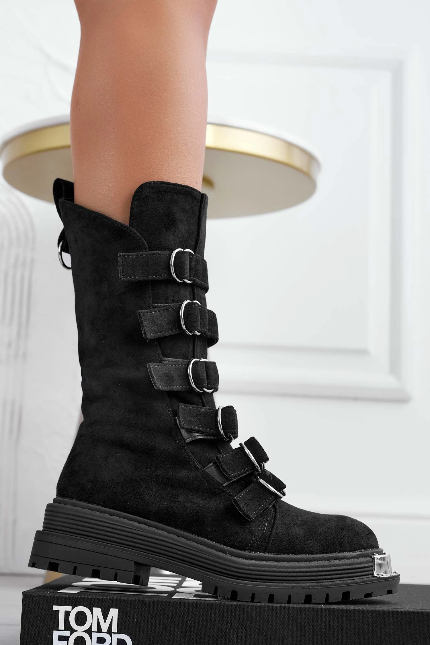 Stivaletti Anfibi Neri Con Fibbie E Placca Argento