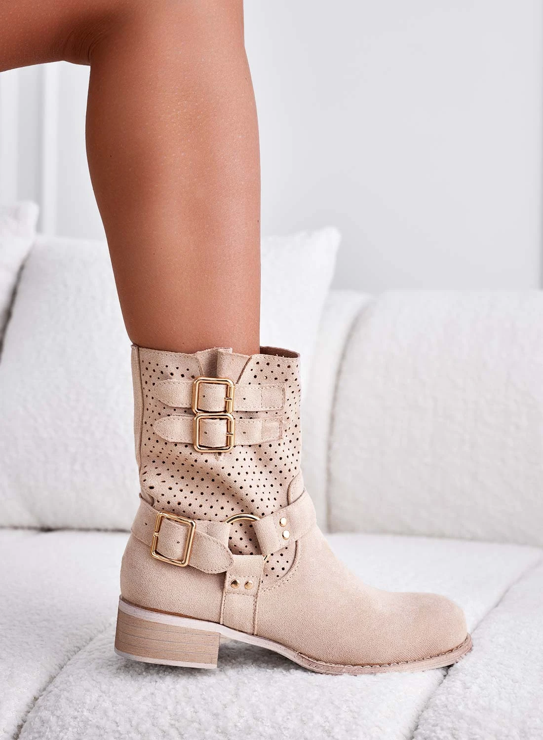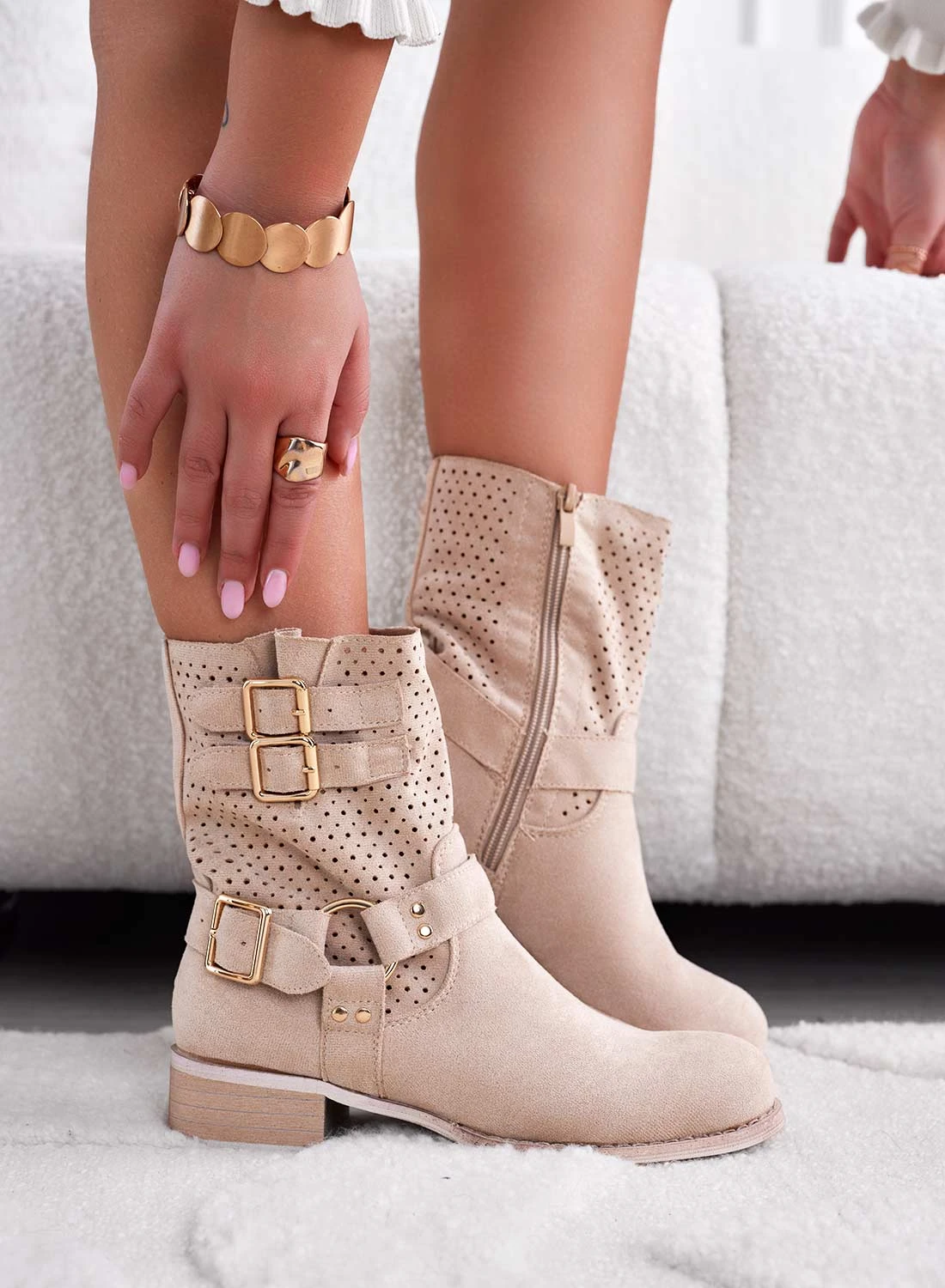 Stivaletti Beige Traforati Con Fibbie Oro