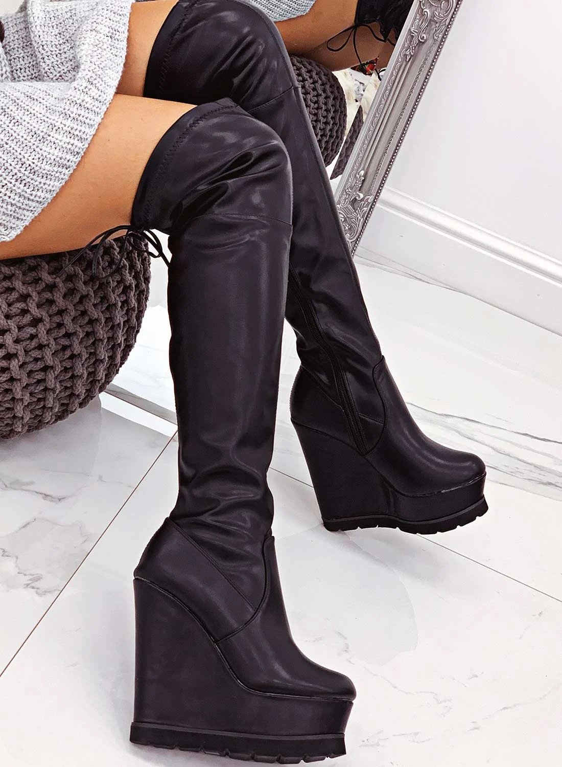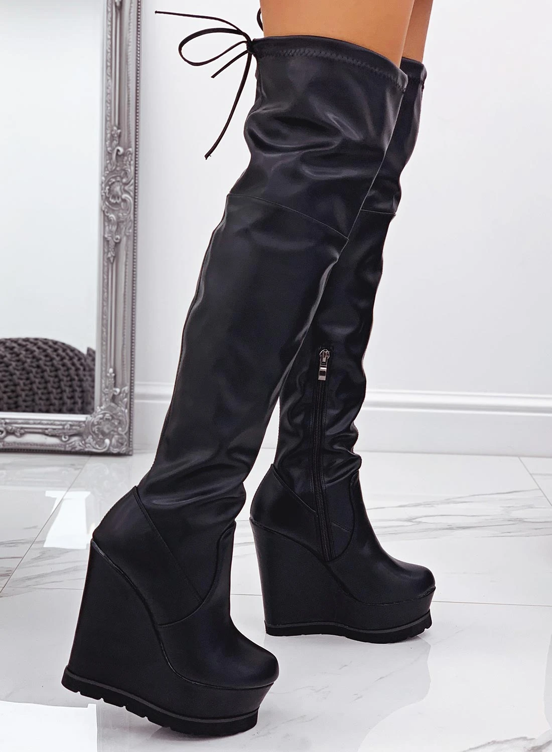 Stivali Neri In Finta Pelle Alla Coscia Con Zeppa