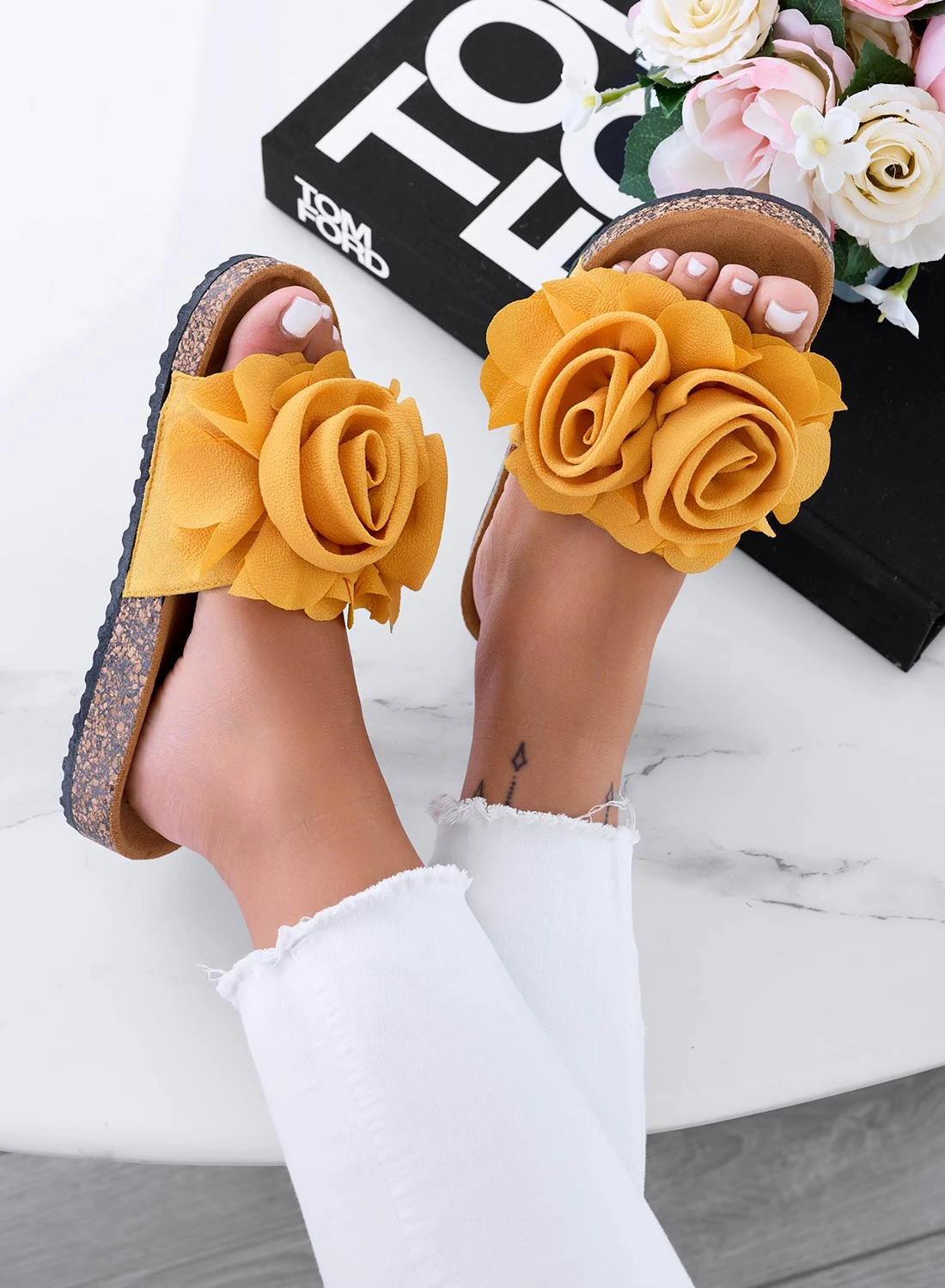🌹 Romanticismo ai tuoi piedi con queste ciabatte flat gialli impreziosite da due maxi rose in rilievo!