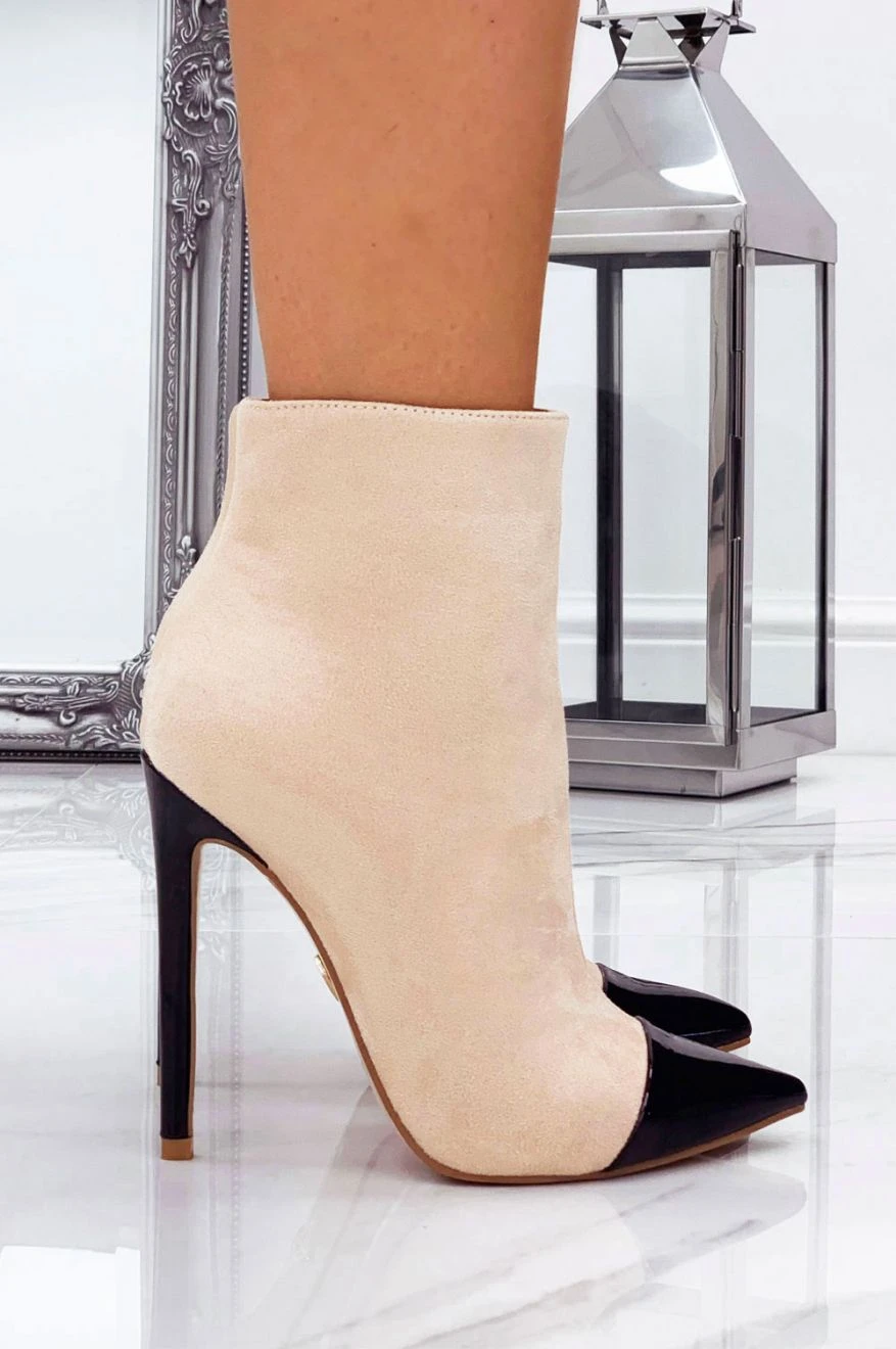 Tronchetti Beige Scamosciati Con Tacco E Punta In Vernice Nera