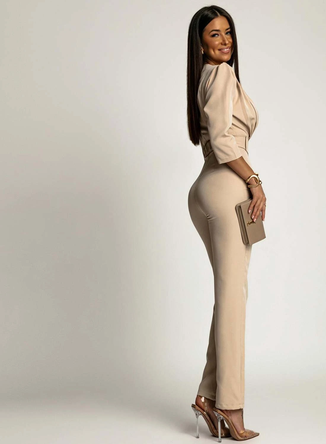Eleganza senza tempo con questa tuta beige elegante, perfetta per un look raffinato e femminile ✨. Il design con scollatura drappeggiata e maniche a 3/4 aggiunge un tocco sofisticato, mentre la cintura in vita valorizza la silhouette creando un effetto slanciato.